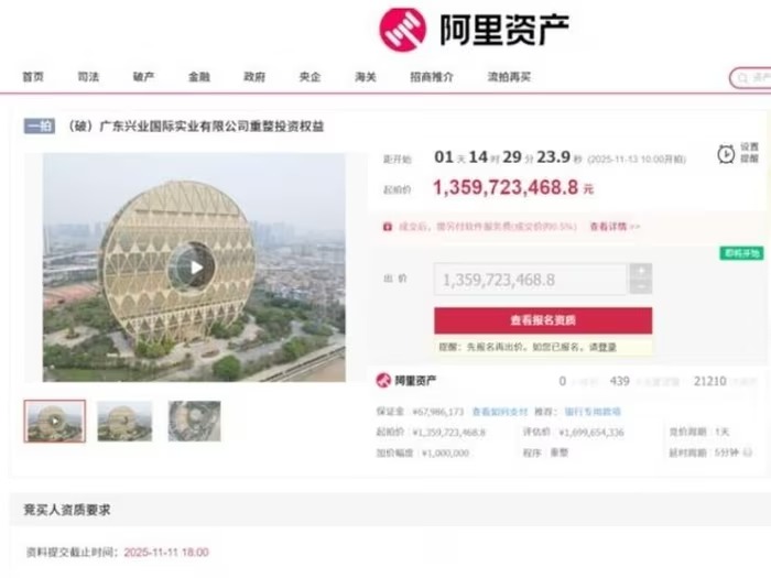 Bên cạnh đó, lý do “ế hàng” cũng có thể nằm ở mức giá của tòa nhà này. Trên nền tảng đấu giá tài sản của Alibaba, mức giá khởi điểm cho “Vòng tròn Quảng Châu” là 1,36 tỷ NDT (4.923 tỷ đồng). Ảnh: Alibaba |