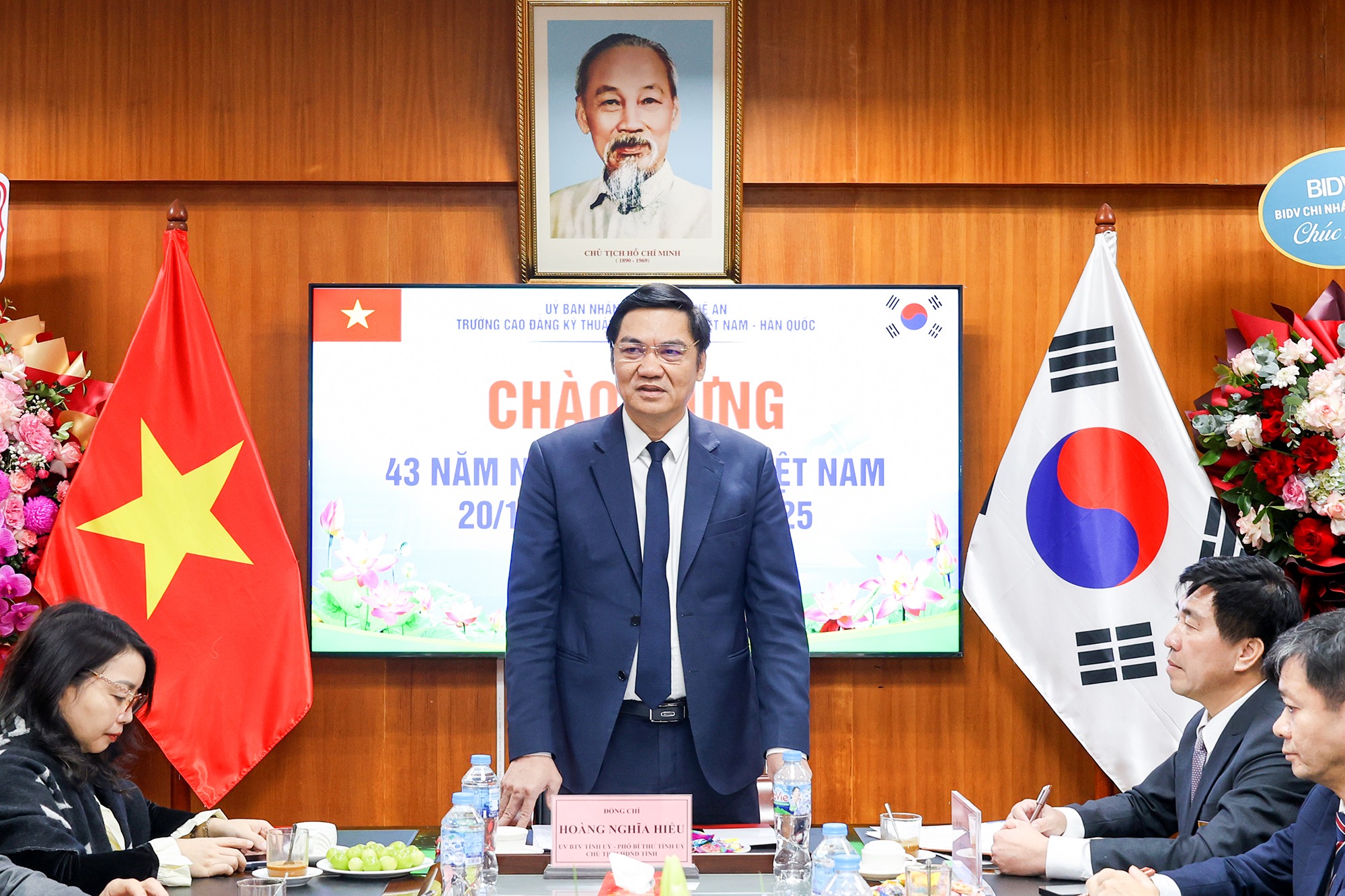 Thay mặt lãnh đạo tỉnh, Phó Bí thư Thường trực Tỉnh ủy, Chủ tịch HĐND tỉnh Hoàng Nghĩa Hiếu ghi nhận và biểu dương những thành tích, nỗ lực đổi mới trong công tác đào tạo của Trường Cao đẳng KTCN Việt Nam - Hàn Quốc, góp phần cung cấp nguồn lao động chất lượng cao cho tỉnh, đáp ứng nhu cầu thị trường và doanh nghiệp.