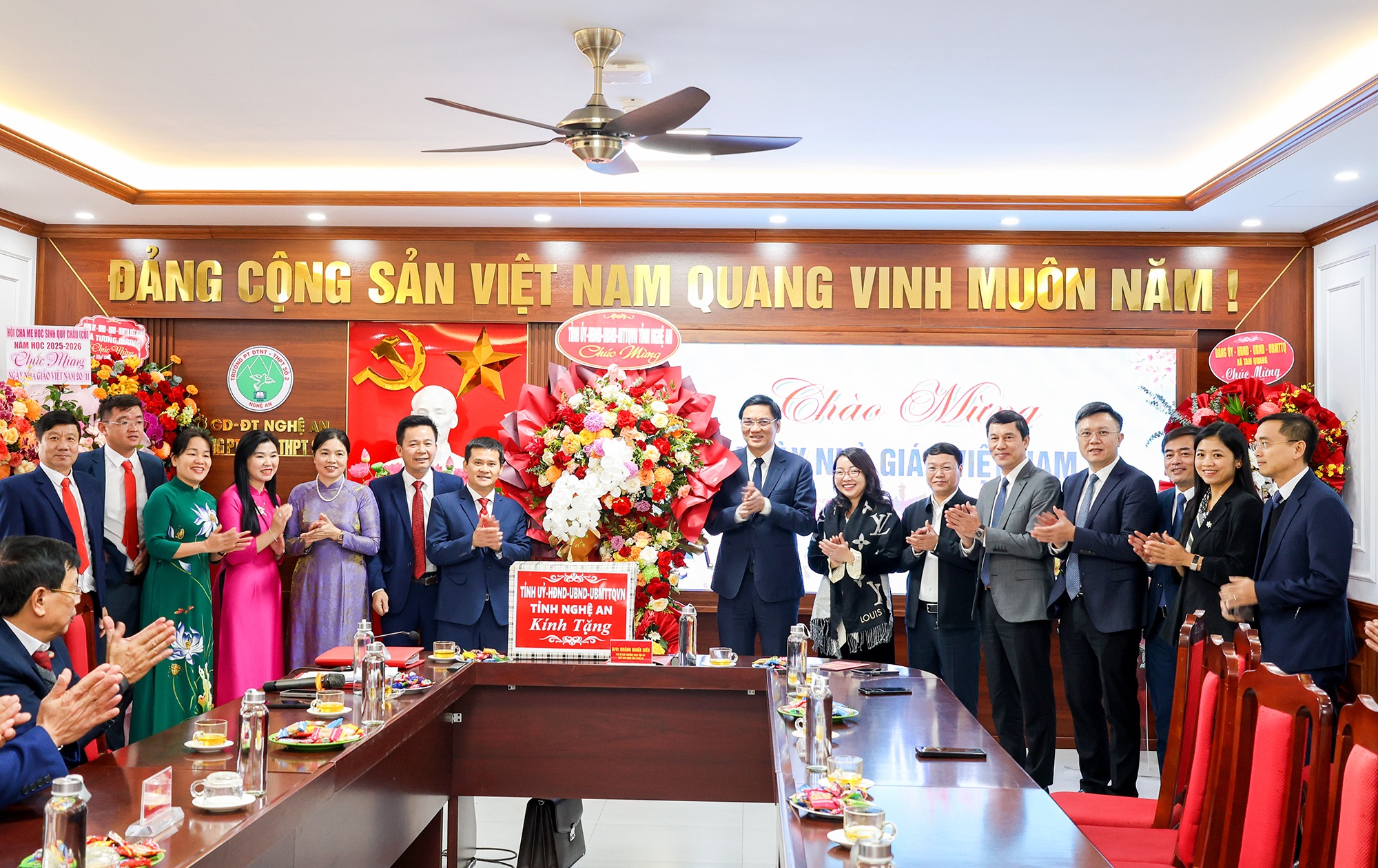 Phó Bí thư Thường trực Tỉnh ủy, Chủ tịch HĐND tỉnh Hoàng Nghĩa Hiếu cùng các thành viên trong đoàn tặng hoa, chúc mừng Trường Phổ thông Dân tộc Nội trú THPT số 2 Nghệ An nhân kỷ niệm 43 năm Ngày Nhà giáo Việt Nam |