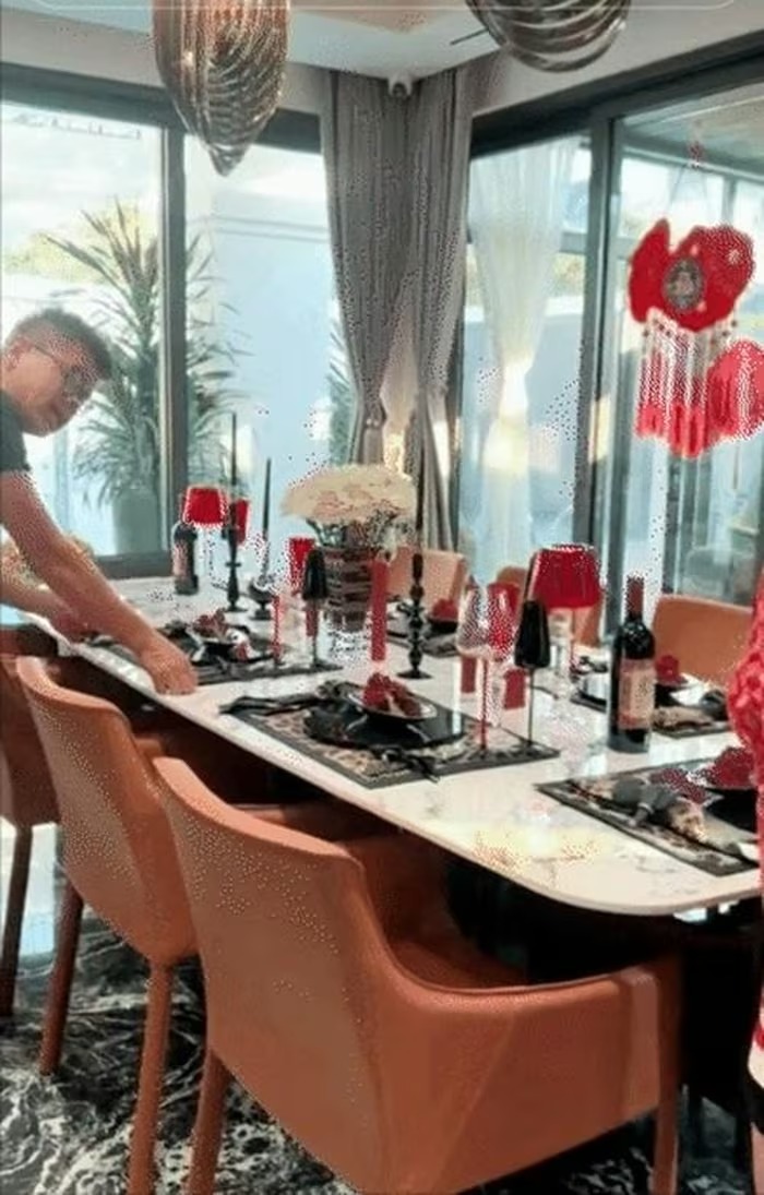 Bộ bàn ăn lớn mang phong cách hoàng gia. Riêng bộ khăn lót đĩa trên bàn ăn giá gần chục triệu một chiếc. Ảnh chụp màn hình |