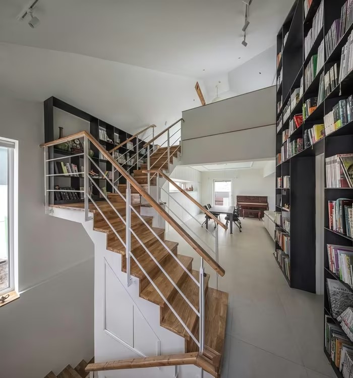 Hệ tủ sách lớn cao kịch trần chạy dọc theo trục cầu thang, tận dụng tối đa chiều cao. Ảnh: Architecture Studio YEIN |