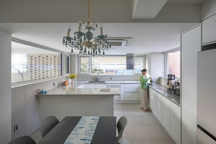Do không đủ diện tích chia thành các phòng ngủ riêng, nhóm thiết kế mở rộng tầng một, tạo sảnh đón mới và biến không gian này thành khu bếp kết hợp phòng ăn. Ảnh: Architecture Studio YEIN |