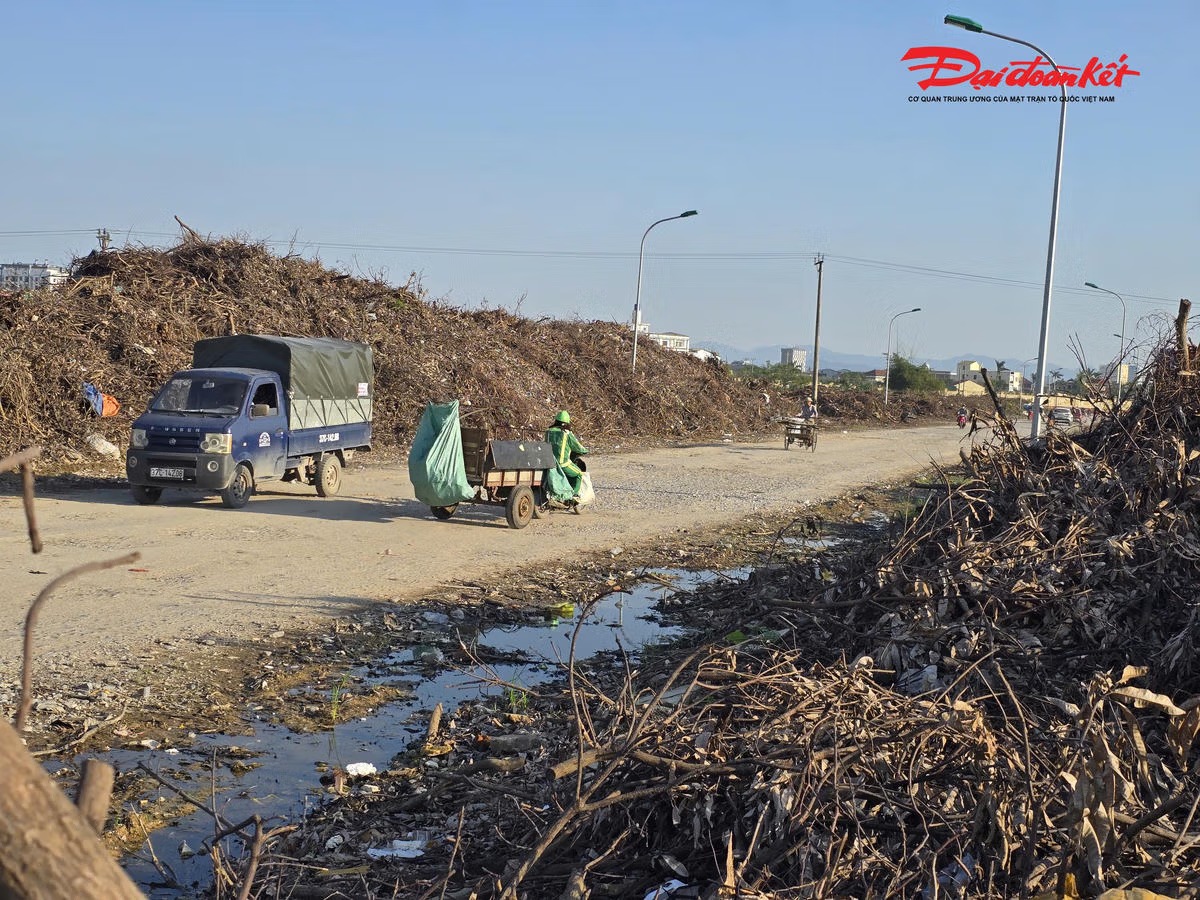 Trước đó, UBND phường Vinh Hưng đã yêu cầu công ty vận chuyển toàn bộ cành, lá cây ra khỏi đường D3 trước ngày 20/9/2025, nhưng đến nay vẫn chưa hoàn thành. Công ty cho biết lượng cành, lá cây khô chưa vận chuyển kịp vì dễ gây cháy, đồng thời đang xin ý kiến tỉnh để thực hiện phương án xử lý. Các bên thống nhất sẽ tận thu rác gỗ cây làm chất đốt, số còn lại sẽ được xúc đi xử lý theo quy định. Hàng ngày, Công ty vẫn phân công xe rác mang các loại rác đã phân hủy đi xử lý. Ảnh: ĐB |