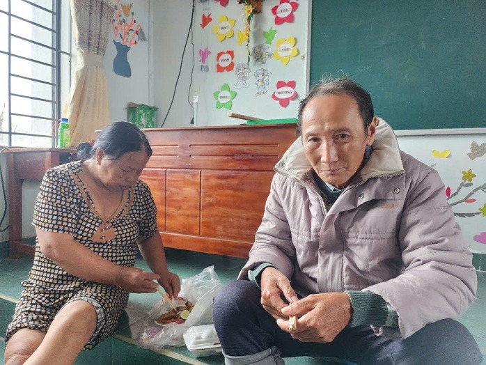 Trong góc phòng học, ông Nguyễn Trí (SN 1964, ngụ thôn Phú Hữu, xã Hòa Thịnh) và vợ là bà Nguyễn Thị Hoa (SN 1967) đang vội ăn hộp cơm từ thiện đầu tiên sau nhiều ngày chỉ ăn mì tôm sống.