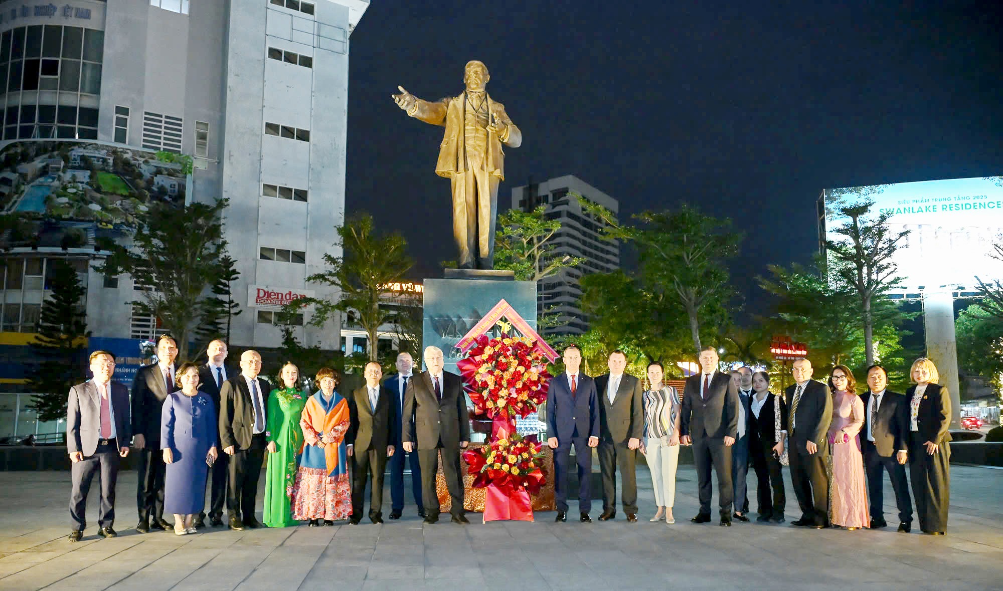 Đoàn đại biểu dâng hoa và chụp hình lưu niệm tại tượng đài Lê Nin |