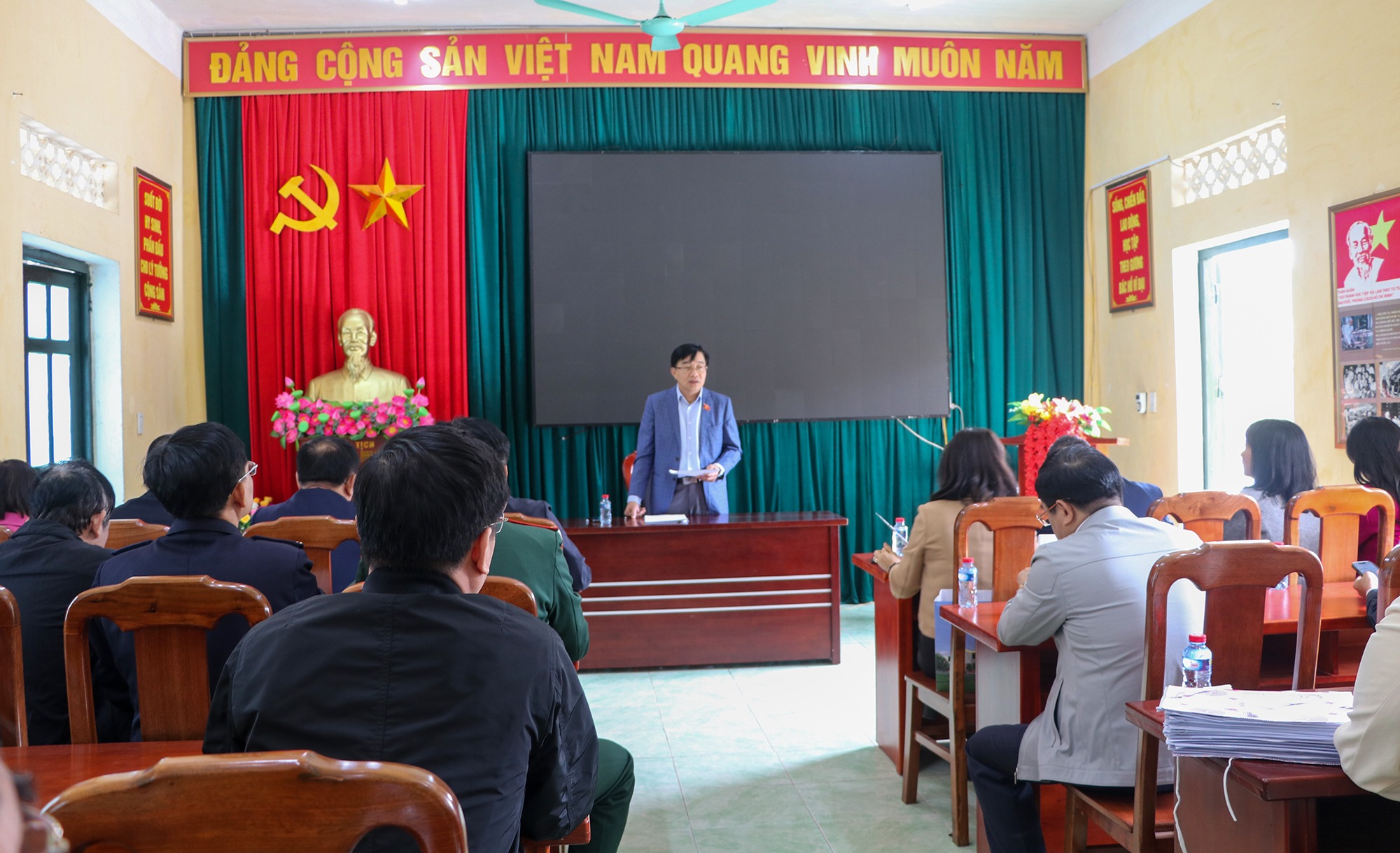 Lãnh đạo xã Hoa Quân báo cáo với đoàn khảo sát việc bố trí tái định cư cho các hộ dân |
