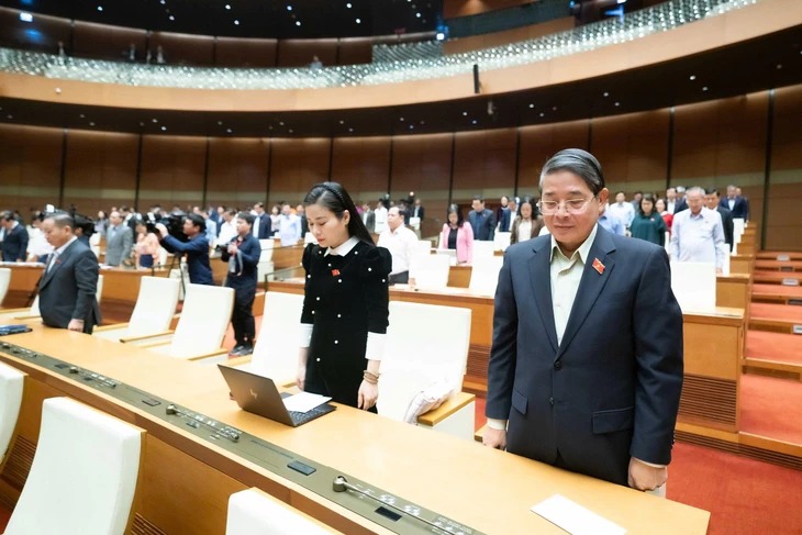Các đại biểu Quốc hội dành một phút mặc niệm đồng bào tử vong do thiên tai - Ảnh: GIA HÂN |