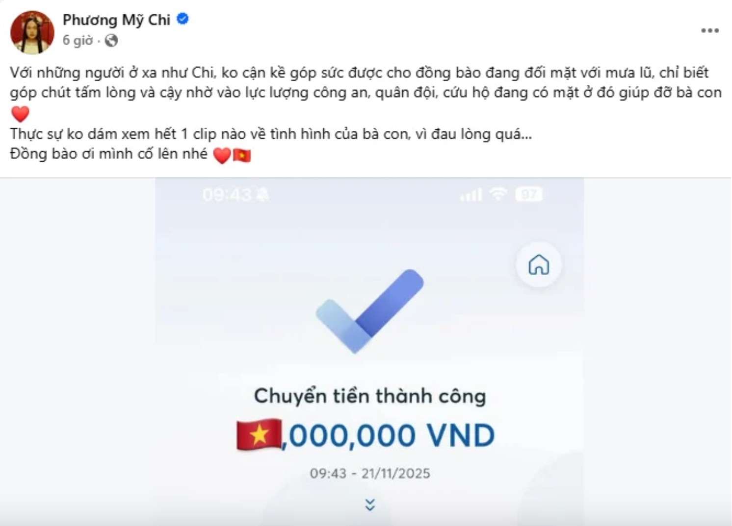Trước đó, khi đang chuẩn bị cho đêm chung kết Miss Universe 2025, Hương Giang đã gửi 100 triệu đồng cứu trợ. Mỹ Tâm và Đức Phúc cũng đều chuyển 100 triệu đồng hướng về Đắk Lắk và các địa phương bị ảnh hưởng.