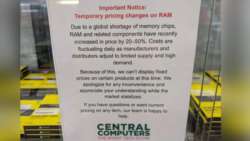 Cửa hàng cho biết sự thiếu hụt chip nhớ trên toàn cầu khiến giá cả thay đổi chóng mặt mỗi ngày. "Vì vậy, chúng tôi không thể niêm yết giá cố định cho một số sản phẩm tại thời điểm này. Nếu bạn có thắc mắc hoặc muốn biết giá mặt hàng nào, đội ngũ của chúng tôi rất sẵn lòng hỗ trợ", thông báo được dán trước một thùng RAM Corsair.