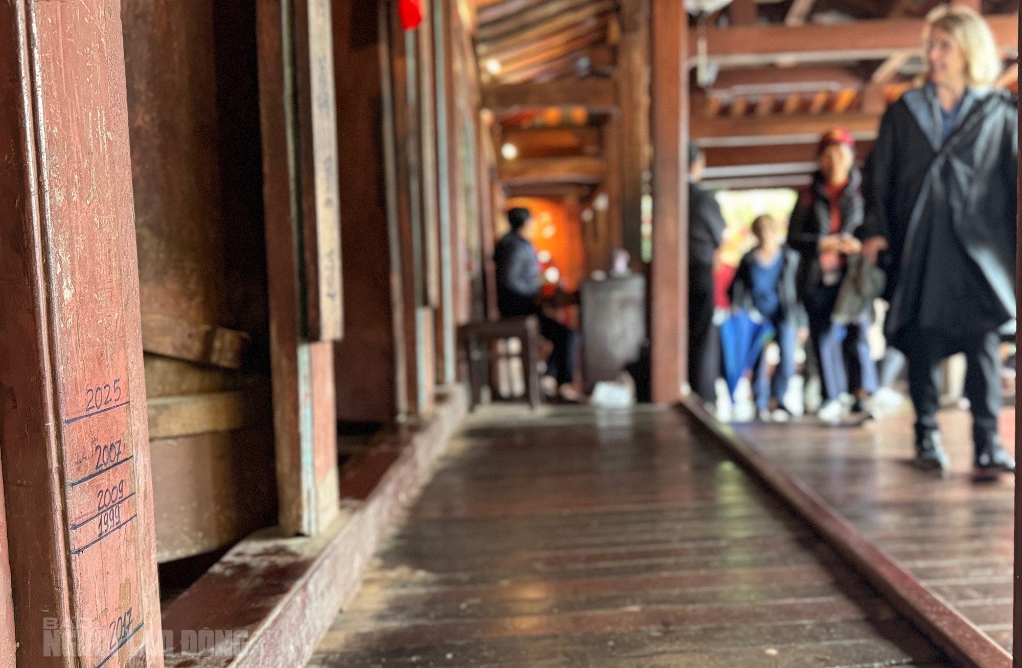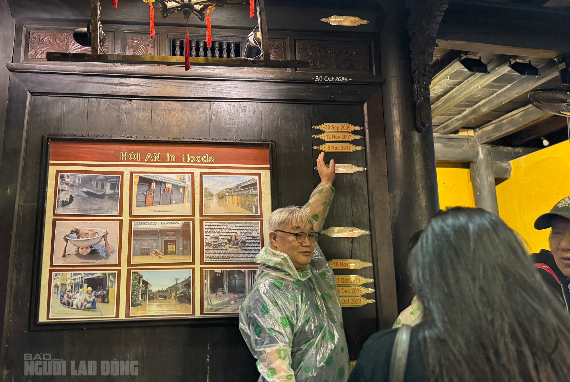 Các mốc lụt được khắc ngay lối vào gian thờ ở giữa Chùa Cầu - biểu tượng của di sản phố cổ Hội An. Mốc cao nhất là năm 2025, ở đây không có mốc của trận lụt năm Giáp Thìn 1964 |