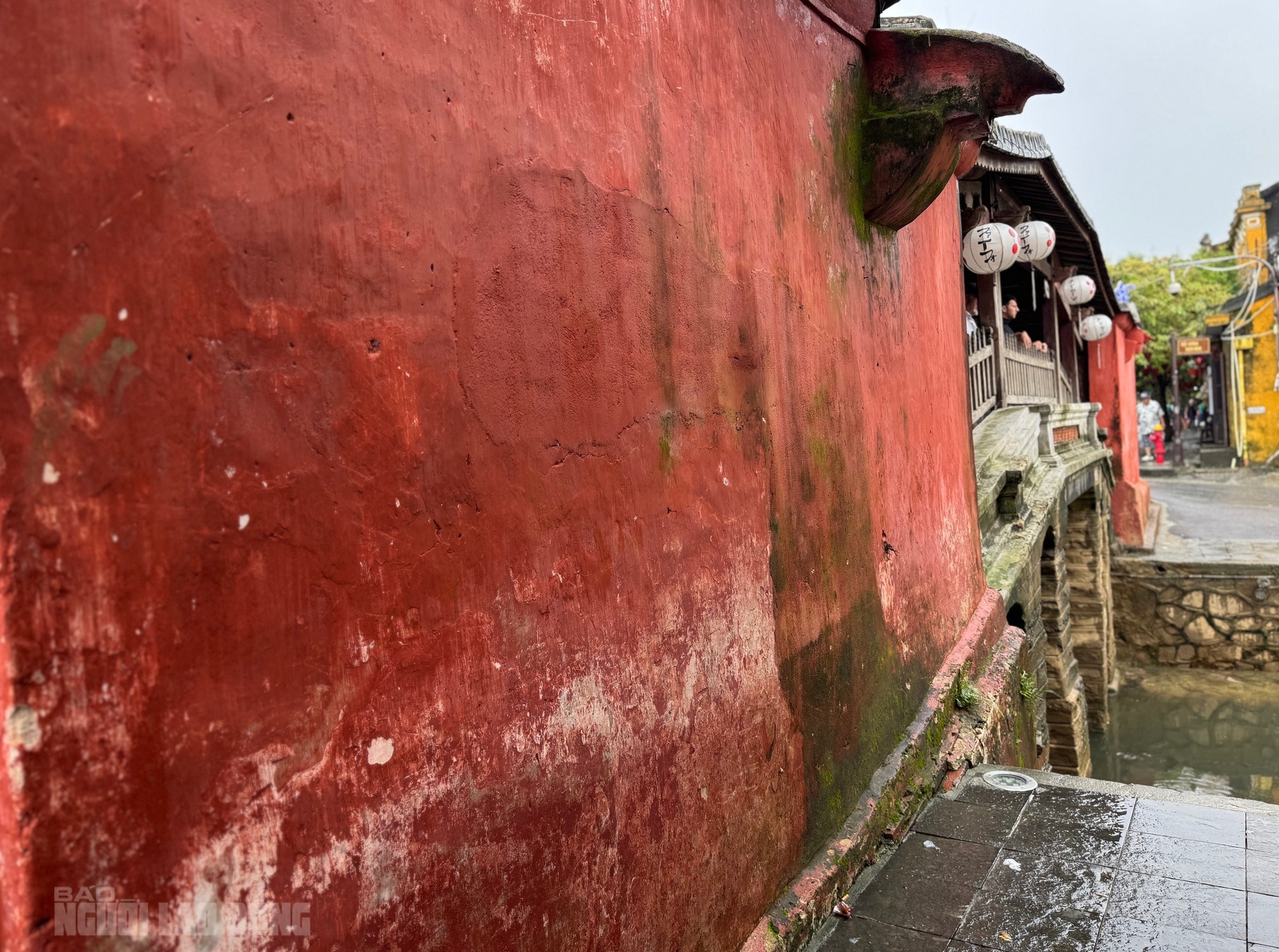 Nhiều mảng tường xung quanh Chùa Cầu bị bong tróc, màu sơn phai đi do ngâm nước trong thời gian dài cộng với tác động của lực nước, hoạt động của tàu, thuyền trong lũ |