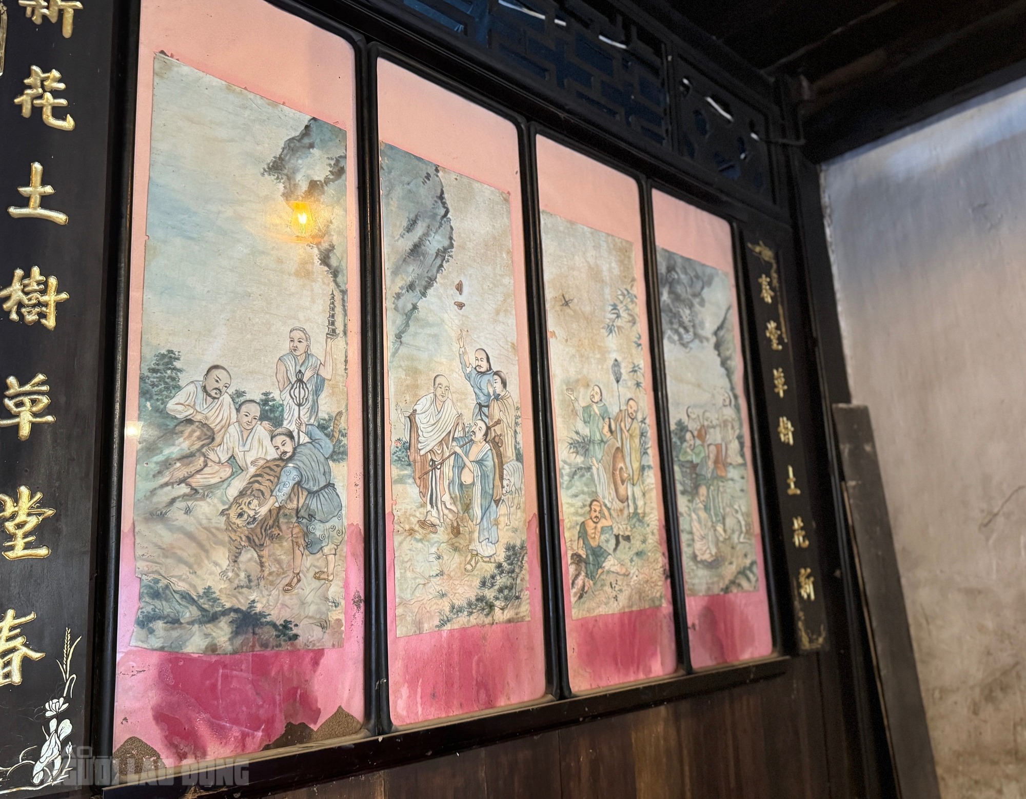Bức tranh cổ trăm tuổi được trang trí ở gian chính của nhà cổ Phùng Hưng bị ngấm nước, loang lổ màu. Bà Lê Thị Mỹ Tuyết, chủ nhà cổ, cho biết do tranh treo ở vị trí cao hơn 1 m so với nền nhà nên không được di dời. Vì vậy, mức ngập 1,4 m làm phần dưới của tranh bị ngâm nước |