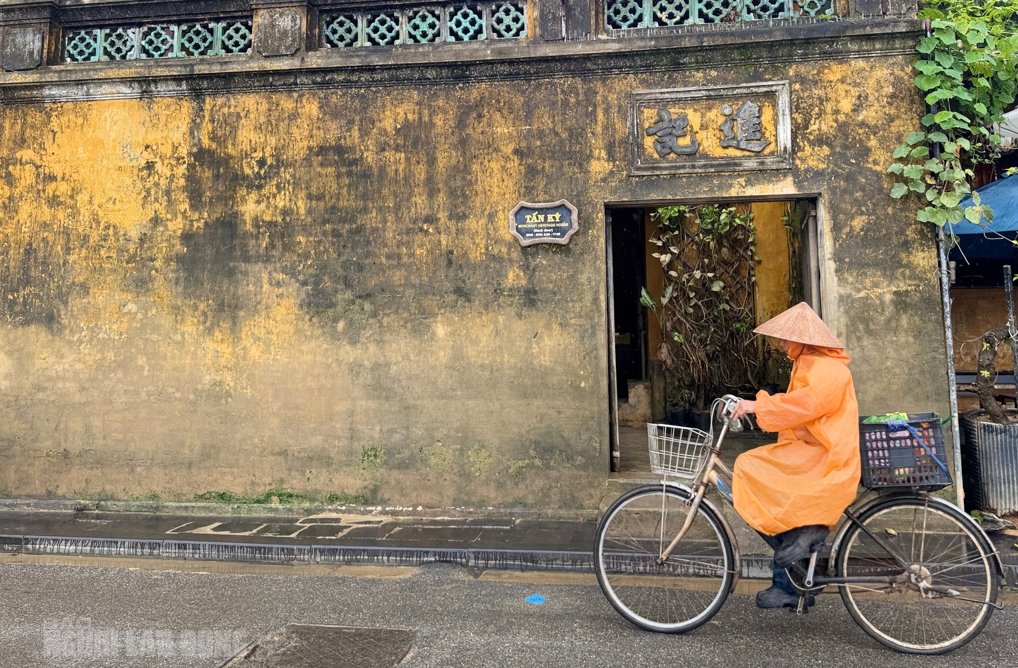 Nhà cổ Tấn Ký ở hai mặt tiền, cổng sau đường Bạch Đằng nhìn ra sông Hoài, cổng trước ở đường Nguyễn Thái Học cũng là điểm bị ngập sâu mỗi khi lũ lụt xảy ra. Phần tường phía sau nhà cổ còn đọng các vết bùn non. Chủ nhân của nhà cổ này muốn giữ lại các vết tích bùn non trên tường để du khách thấy được hình ảnh phố cổ qua các đợt thiên tai, lũ lụt |