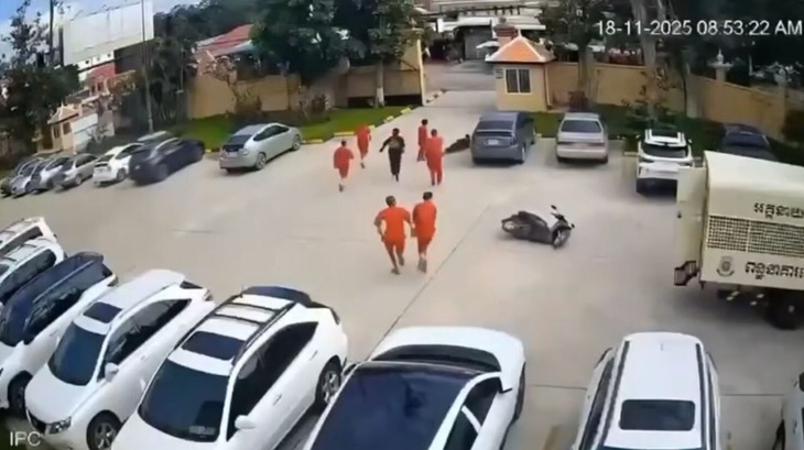 Cụ thể, vụ việc xảy ra lúc 8h53 sáng ngày 18-11, khi nhóm phạm nhân được đưa tới Tòa án tỉnh Svay Rieng. Camera an ninh ghi lại cảnh một phụ nữ đội mũ lưỡi trai xuất hiện ở khu vực bãi xe, theo dõi sát thời điểm xe chở tù nhân dừng lại.
