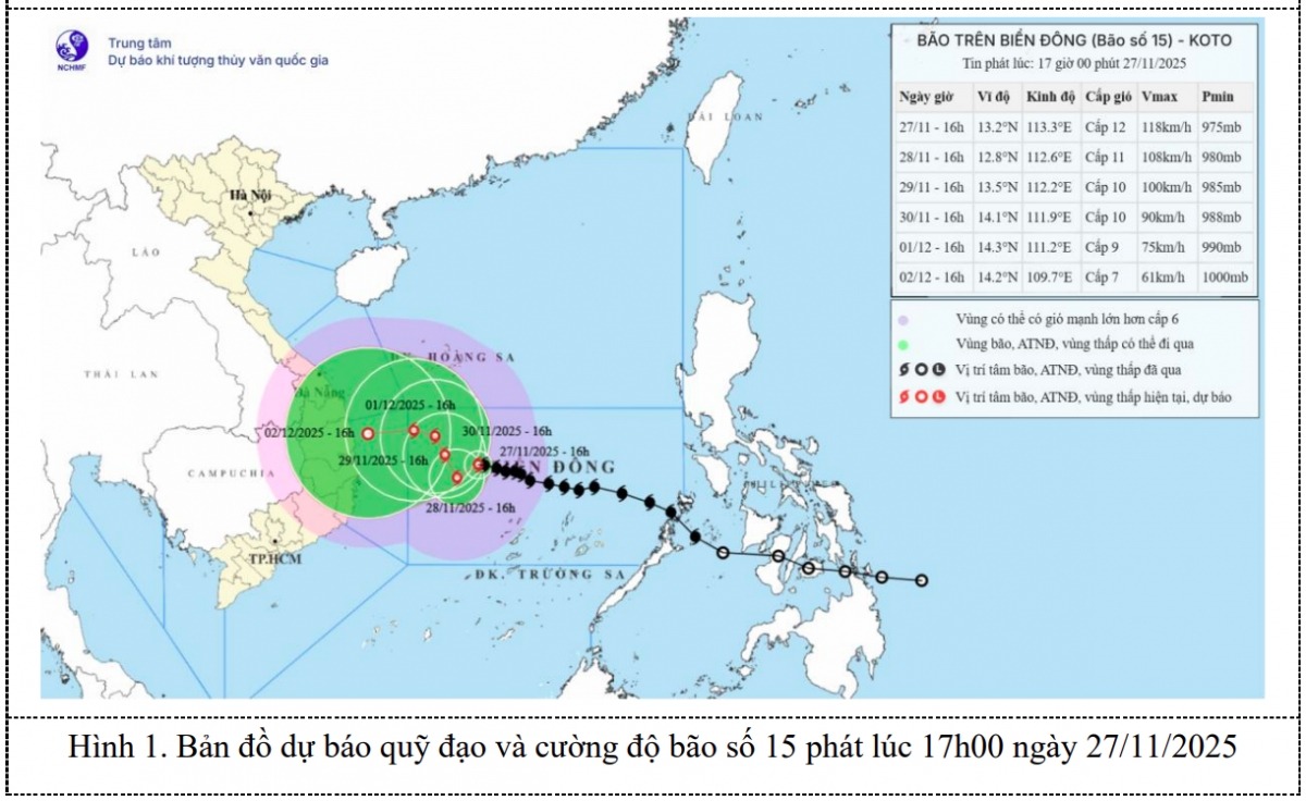 Theo Trung tâm Dự báo Khí tượng Thủy văn Quốc gia, hồi 16 giờ ngày 27/11, tâm bão số 15 nằm ở khoảng 13,2 độ Vĩ Bắc; 113,3 độ Kinh Đông, cách đảo Song Tử Tây khoảng 230 km về phía Bắc Tây Bắc. Sức gió mạnh nhất vùng gần tâm bão đạt cấp 12 (118–133 km/h), giật cấp 15. Bão di chuyển theo hướng Tây với tốc độ 5–10 km/h.