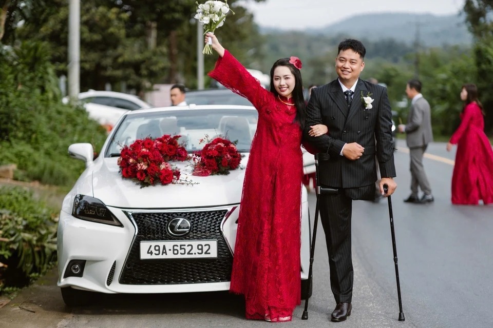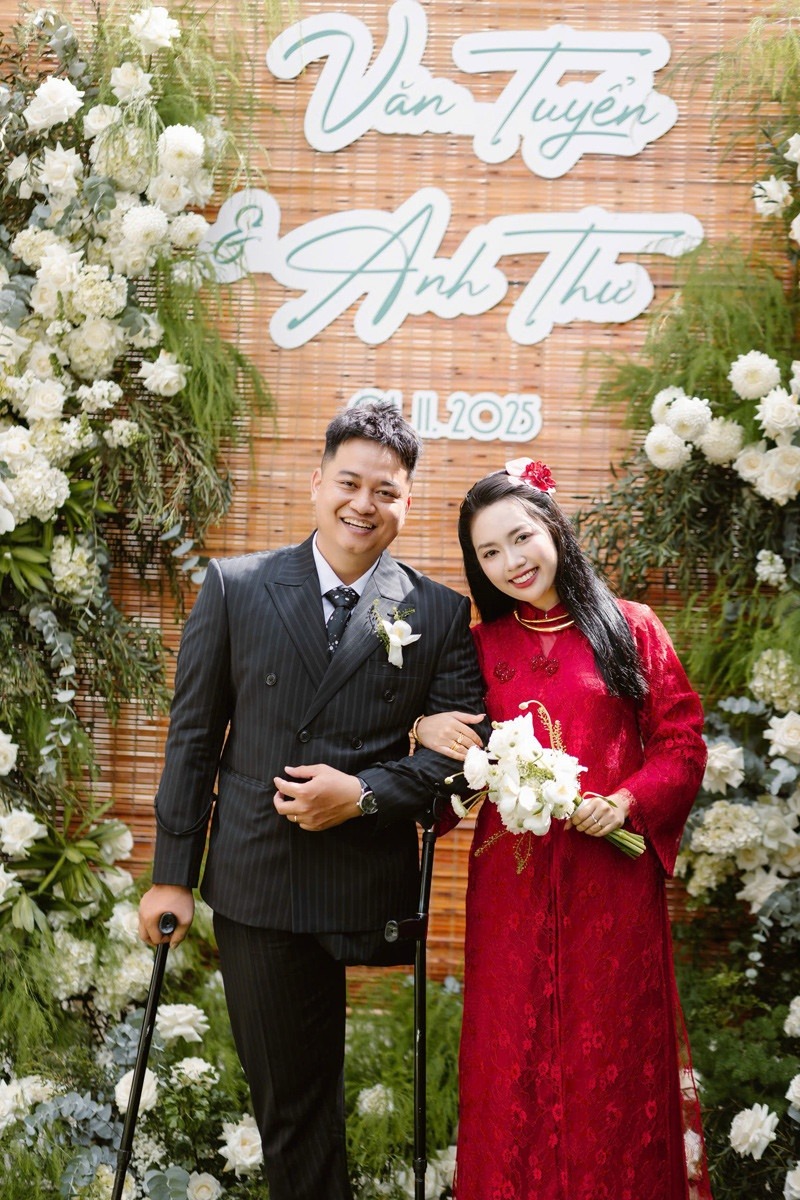 Ngày 1/11, đám cưới của Bùi Văn Tuyển (sinh năm 1997, hiện sống tại TP.HCM) và cô dâu Anh Thư (sinh năm 2001) diễn ra tại Lâm Đồng - quê nhà của cả hai. Điều khiến quan khách xúc động là hình ảnh chú rể 1 chân tự mình chống nạng vào đón cô dâu.