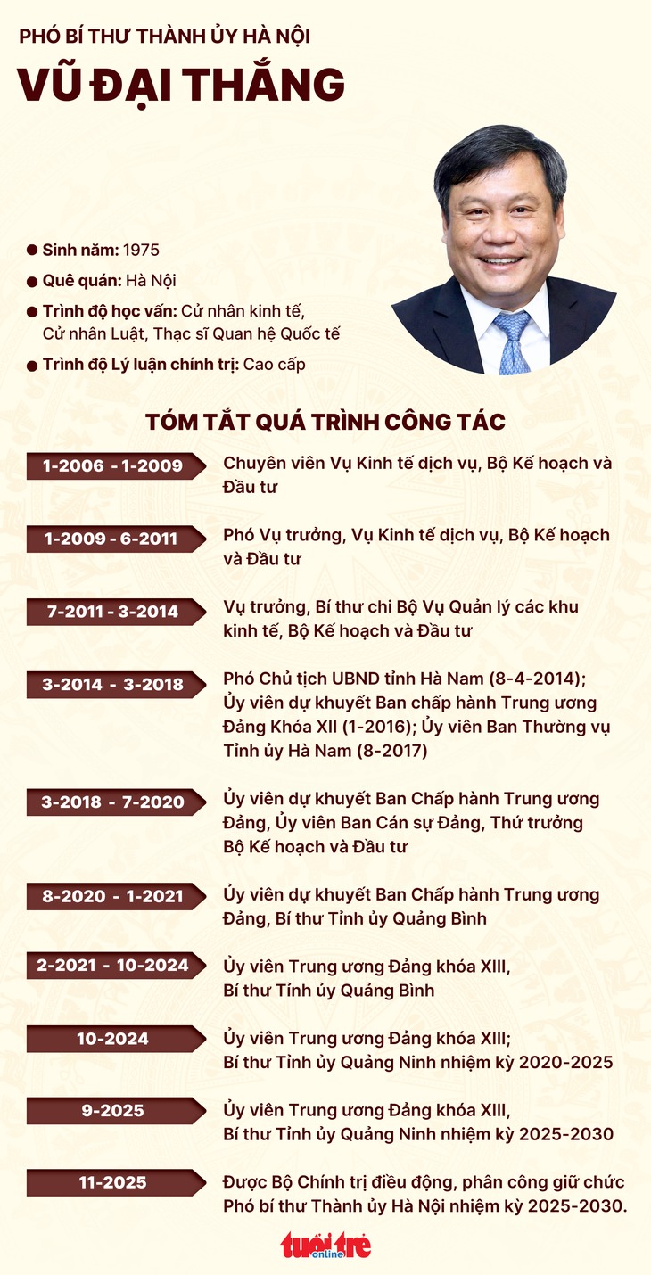 Quá trình công tác của tân Phó bí thư Thành ủy Hà Nội Vũ Đại Thắng - Đồ họa: NGỌC THÀNH |