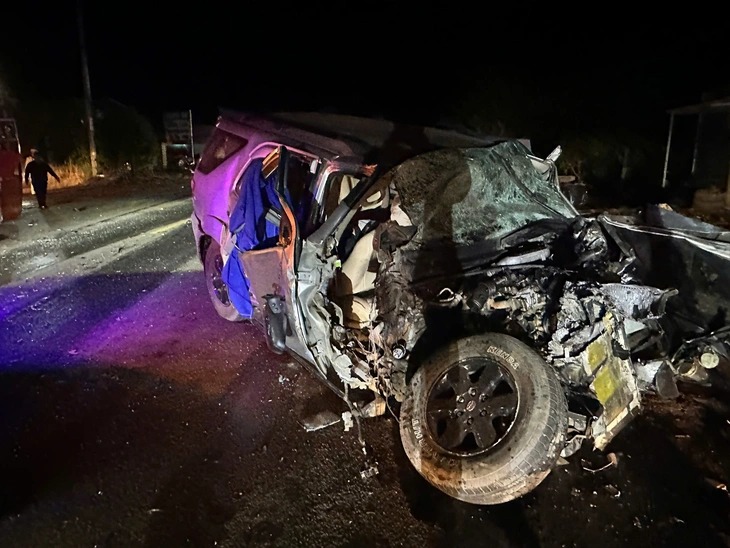 Đầu ô tô nát bét sau cú tông trực diện vào xe giường nằm trên quốc lộ 14, xã Nhân Cơ, tỉnh Lâm Đồng (vùng Đắk Nông cũ) - Ảnh: M.THỨC |