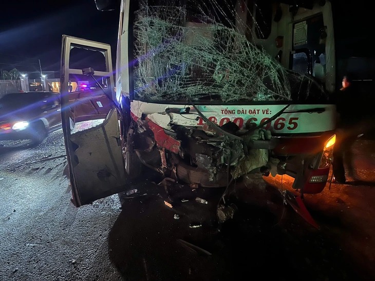 Đầu xe khách giường nằm cũng hư hỏng nặng sau cú tông - Ảnh: M.THỨC |