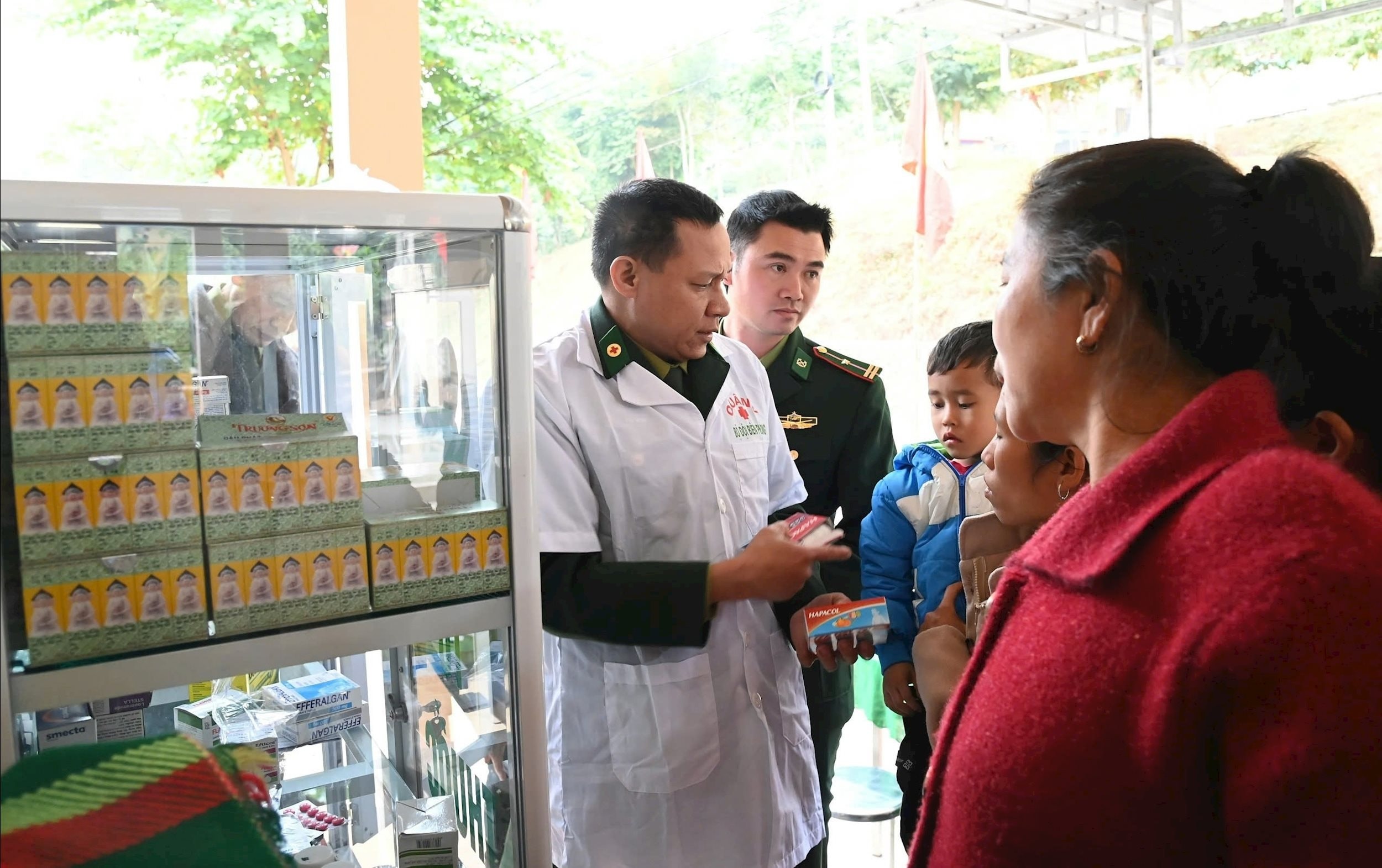 Quân y đồn Biên phòng Nhôn Mai cấp thuốc cho người dân tại Tủ thuốc biên cương đồn Biên phòng Nhôn Mai |