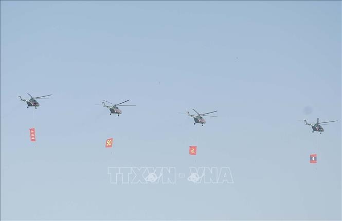 Biên đội máy bay trực thăng mang cờ bay trên bầu trời khu vực tổ chức lễ kỷ niệm. Ảnh: Thống Nhất /TTXVN |