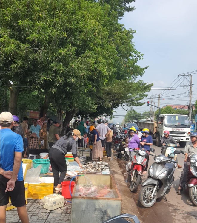 Một số tiểu thương mang theo thùng đá, cân điện tử để thu mua cá tại chỗ, tạo thành một chợ tự phát ngay ven hồ. Số khác tập trung tại điểm đầu đường rẽ vào chân đập, khoảng 1,5 km để trao đổi "chiến lợi phẩm".