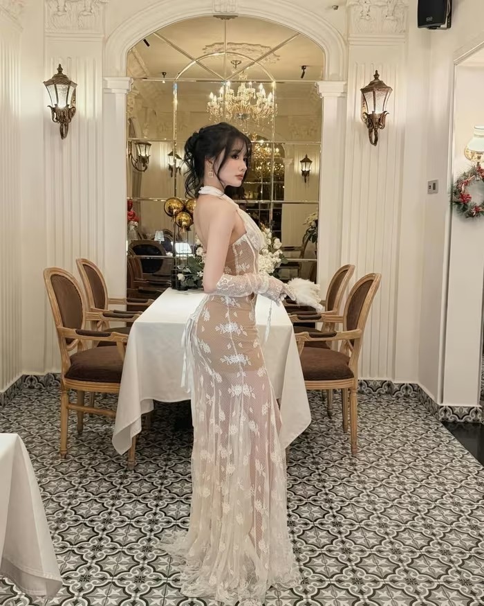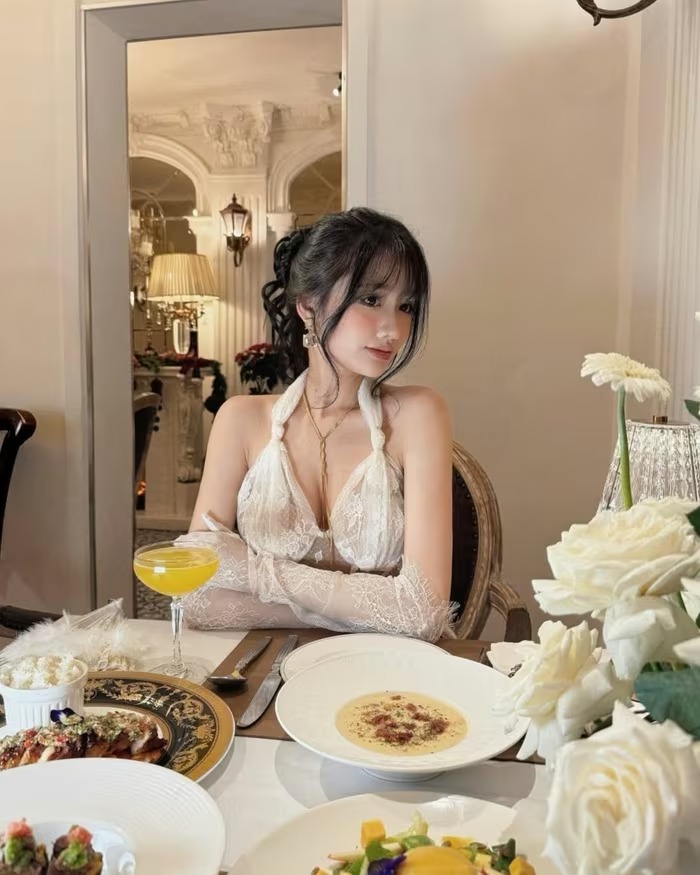 Trong bộ ảnh mới, hot TikToker xuất hiện tại một không gian nhà hàng sang trọng, lãng mạn. Cô chọn cho mình một chiếc đầm dài được làm từ chất liệu ren trắng mỏng manh, thiết kế theo phong cách xuyên thấu đầy mê hoặc.(Ảnh: IGNV) |