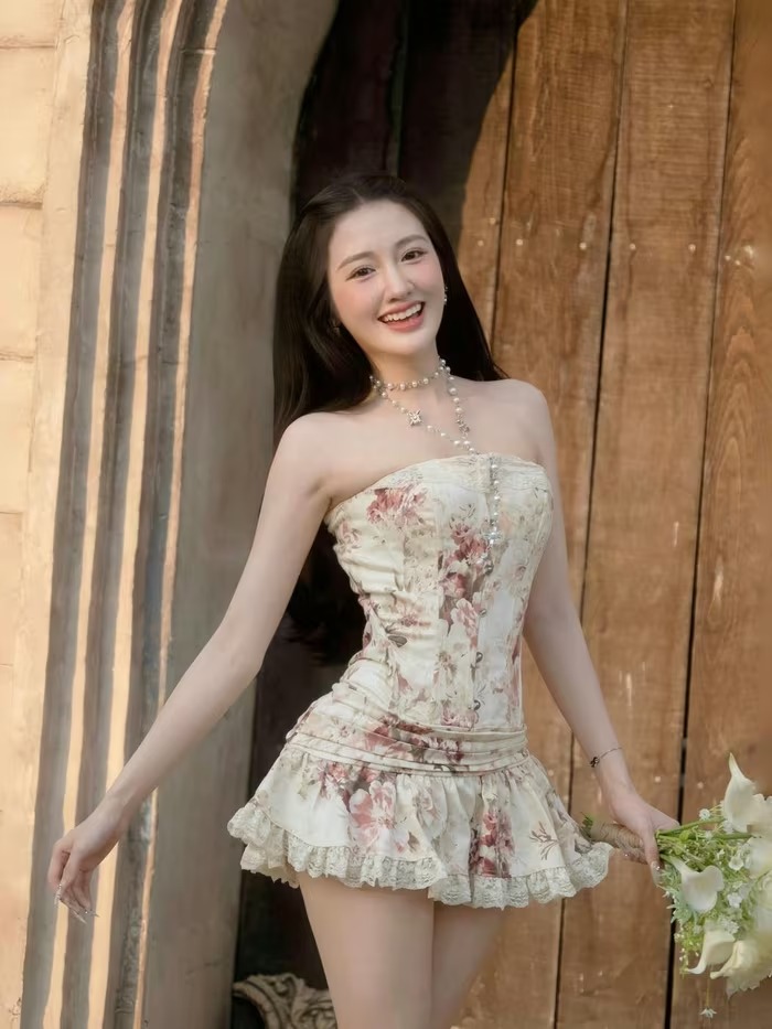 Chiếc váy có phom dáng cổ yếm, kết hợp với các chi tiết đường may và họa tiết ren nổi bật ở phần thân trên. (Ảnh: IGNV) |