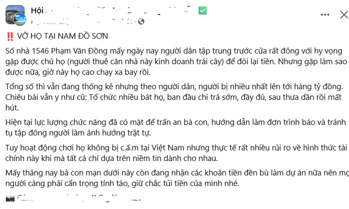 Hiện, chị N.T.L. và anh N.Đ.H. đã đóng cửa hàng, không có mặt ở cửa hàng và không liên lạc được. Do đó, số người chơi hụi đến đòi lại tiền đóng hụi và livestream trực tiếp lên mạng xã hội.