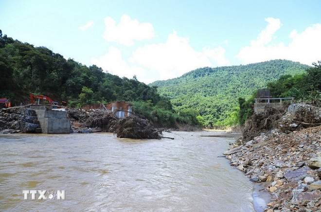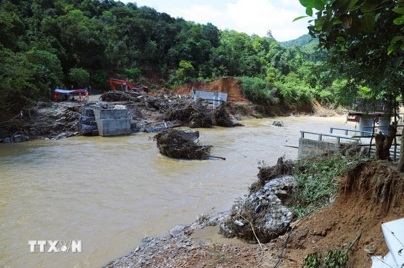 Hiện trường cầu Xốp Chạng (km82+900) trên quốc lộ 48C bị lũ dữ tàn phá, cuốn trôi nhịp cầu trong ngày 29/9. (Ảnh: Xuân Tiến/TTXVN) |