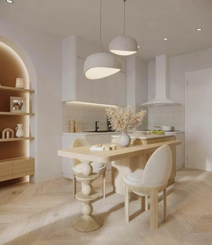 Khu bếp thiết kế với tông trắng chủ đạo, hài hòa với kiến trúc tổng thể. Ảnh: FBNV |