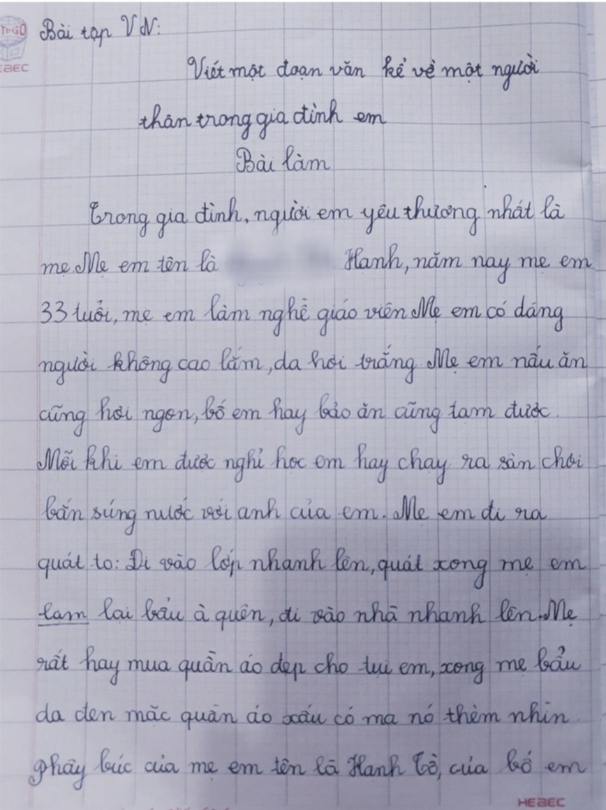 “Trong gia đình, người em yêu thương nhất là mẹ. Mẹ em tên là Hạnh, năm nay mẹ em 33 tuổi, mẹ em làm nghề giáo viên. Mẹ em có dáng người không cao lắm, da hơi trắng. Mẹ em nấu ăn cũng hơi ngon, bố em hay bảo ăn cũng tạm được.