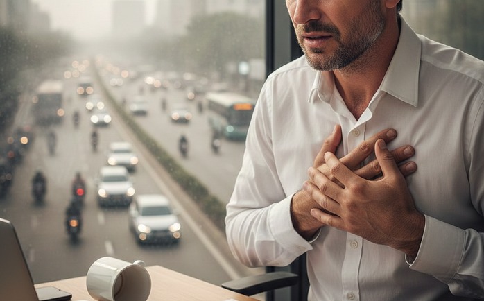 Phơi nhiễm lâu dài với ô nhiễm không khí có thể làm tăng nguy cơ nhồi máu cơ tim - Minh họa AI: THU ANH |