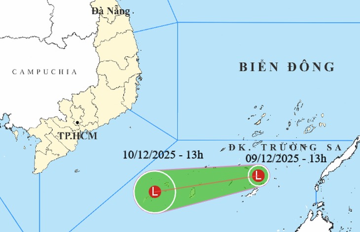 Trung tâm Dự báo khí tượng thủy văn quốc gia cho biết chiều nay vị trí trung tâm vùng áp thấp ở vào khoảng 8 - 9 độ vĩ bắc; 114 - 115 độ kinh đông. Tức ở phía nam đặc khu Trường Sa.