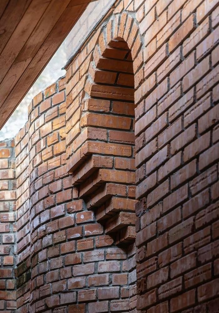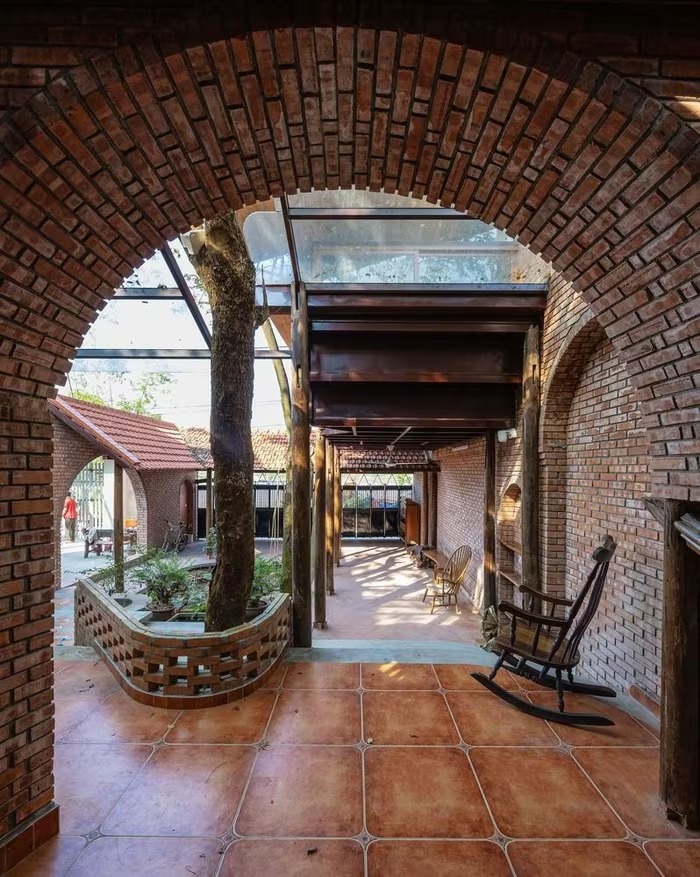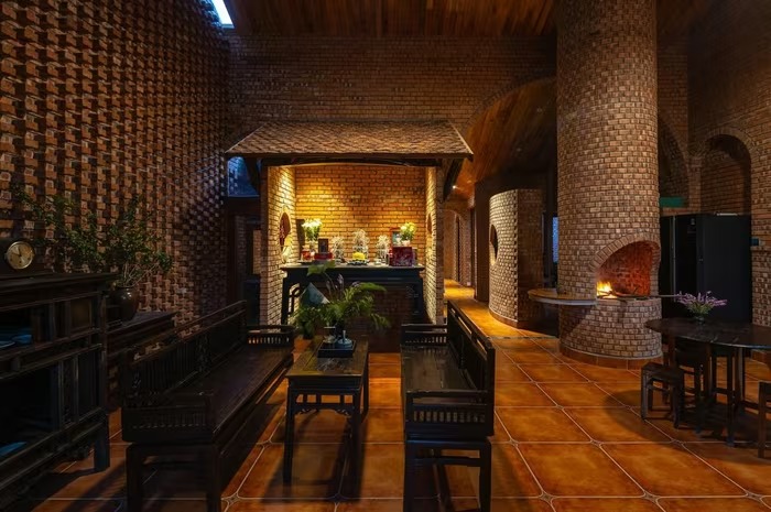 Ngôi nhà gồm 1 tầng và một phòng ngủ ở gác lửng. Toàn bộ không gian xây bằng gạch mộc, tạo nên sự trầm mặc, mang nét hoài cổ. Ảnh: Trieu Chien |