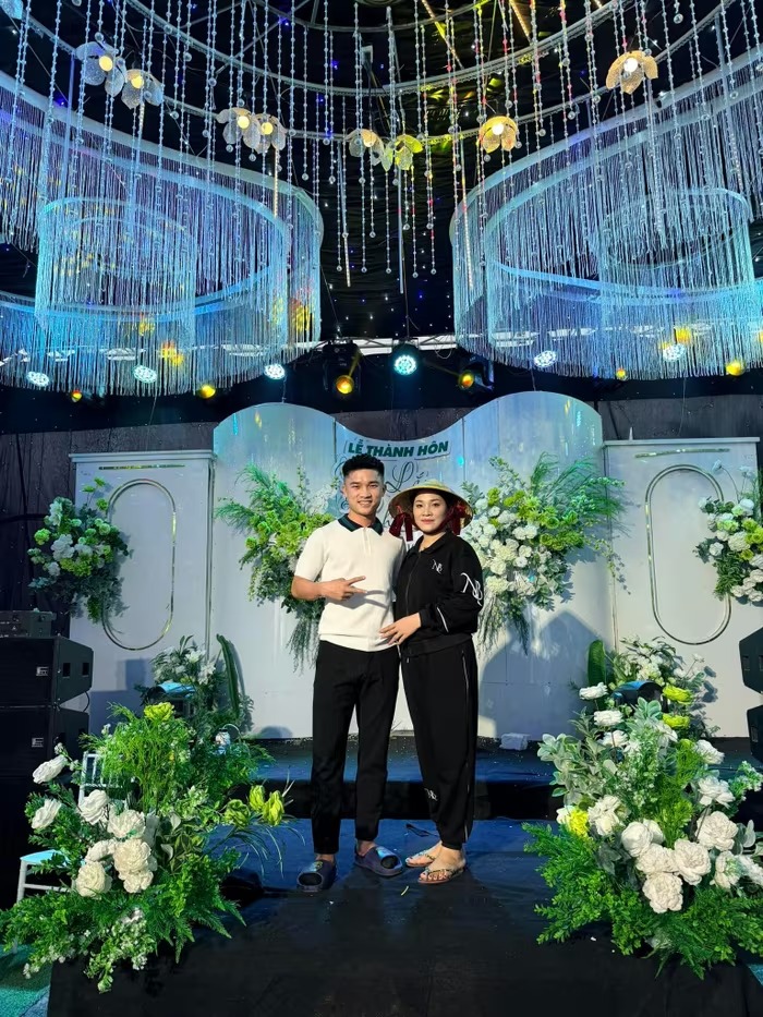 Đêm trước đám cưới, Văn Lắm chia sẻ hình ảnh về khung cảnh hôn trường nhà trai tại Mỹ Sơn, Đô Lương cũ. Bối cảnh được trang hoàng với hoa tươi và những chùm đèn pha lê lấp lánh, với tông màu chủ đạo trắng và xanh.
