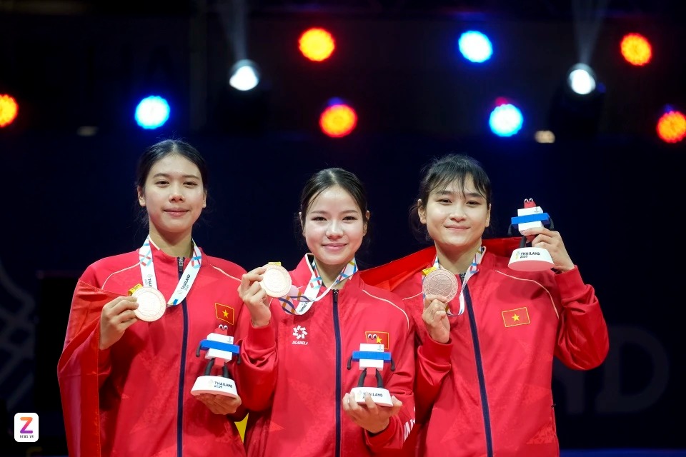 Kim Uyên cùng hai đồng đội Nguyễn Thị Kim Hà và Lê Ngọc Hân nhận huy chương đồng trong ngày thi đấu 10/12. |