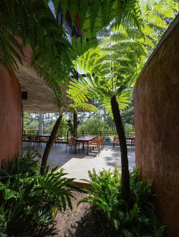 Từ đây, các không gian dần dần đổ xuống rừng thông, những thay đổi tinh tế về độ cao tạo nên sự gần gũi và tương tác. Ảnh: Trieu Chien |