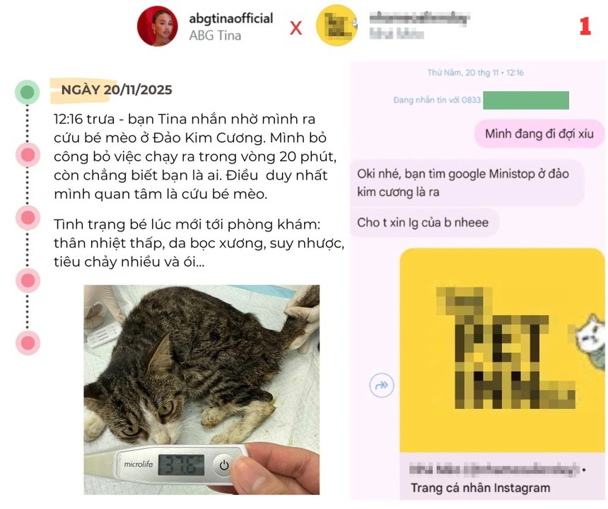 Đến ngày 27/11, khi sức khỏe mèo ổn định, Tina tiếp tục nhờ L. đón về chăm sóc tạm vì bận công việc ở Hà Nội. Sau đó, L. cũng gửi hóa đơn viện phí cho Tina, tổng cộng 6,6 triệu đồng, được giảm 20% còn 5,3 triệu đồng.