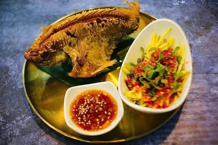 Khi gắp miếng cá chiên, cuốn cùng xoài bào hoặc ăn xen kẽ, vị béo của cá hòa với vị chua mặn của xoài tạo nên cảm giác hài hòa, không ngấy.