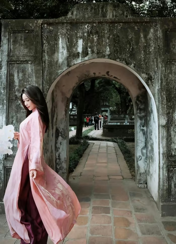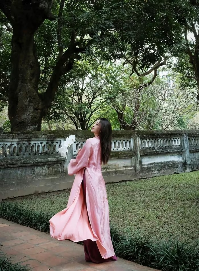 Trong bộ áo dài dáng suông truyền thống, gam hồng phấn nhẹ nhàng tôn lên làn da trắng mịn và vóc dáng thon gọn của Võ Nhật Linh. Thiết kế tối giản, không quá cầu kỳ nhưng lại làm nổi bật thần thái nữ tính, kín đáo mà vẫn cuốn hút. |