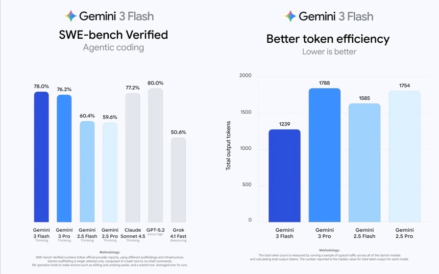 Với những tác vụ suy luận, Gemini 3 Flash dùng ít hơn 30% token so với 2.5 Pro, về lý thuyết giúp người dùng tiết kiệm chi phí với một số yêu cầu nhất định.
