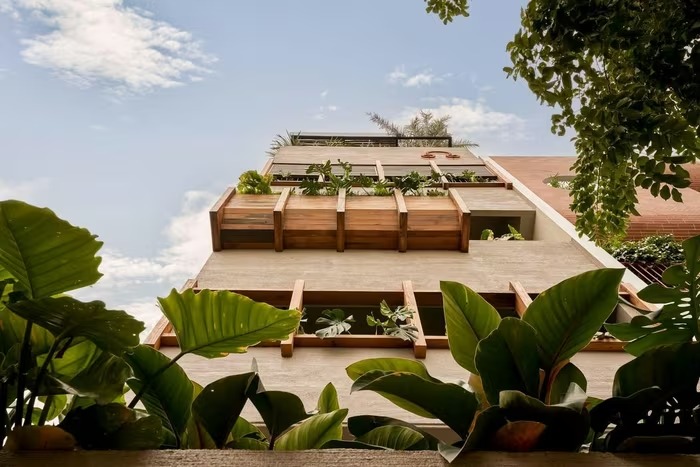 Mặt đứng của ngôi nhà được tạo thành từ nhiều lớp đặc - rỗng, gỗ biến tính, lam chớp, cây xanh...giống như một hệ sinh thái sống động treo lơ lửng giữa không trung. Ảnh: Phú Đào |