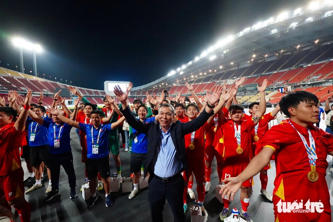 Chủ tịch VFF Trần Quốc Tuấn ăn mừng HCV SEA Games 33 với các cầu thủ U22 Việt Nam - Ảnh: NAM TRẦN |