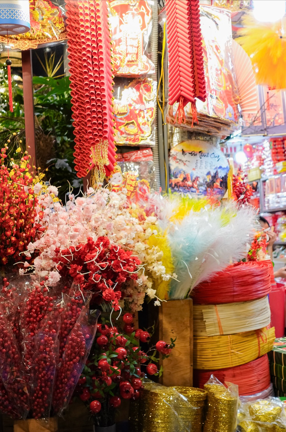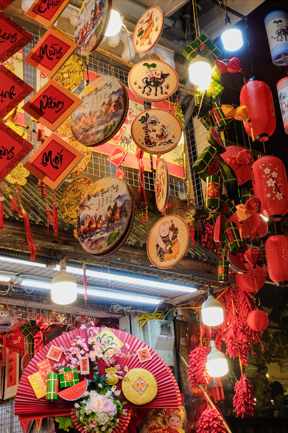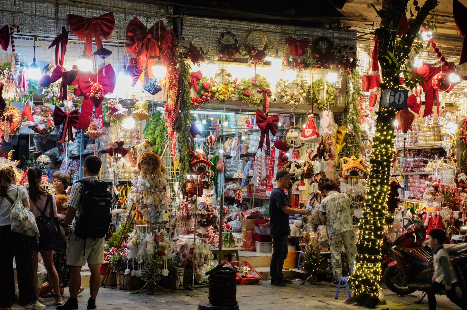 Những quả cầu trang trí đỏ rực, dây treo chữ chúc năm mới, phong bao lì xì, đồ decor mang không khí xuân bắt đầu xuất hiện ngay cạnh các cửa hàng bán đồ Giáng sinh. Màu đỏ đặc trưng của Tết nổi bật hẳn lên giữa không gian Noel, tạo nên một khung cảnh vừa lạ lẫm, vừa thú vị.