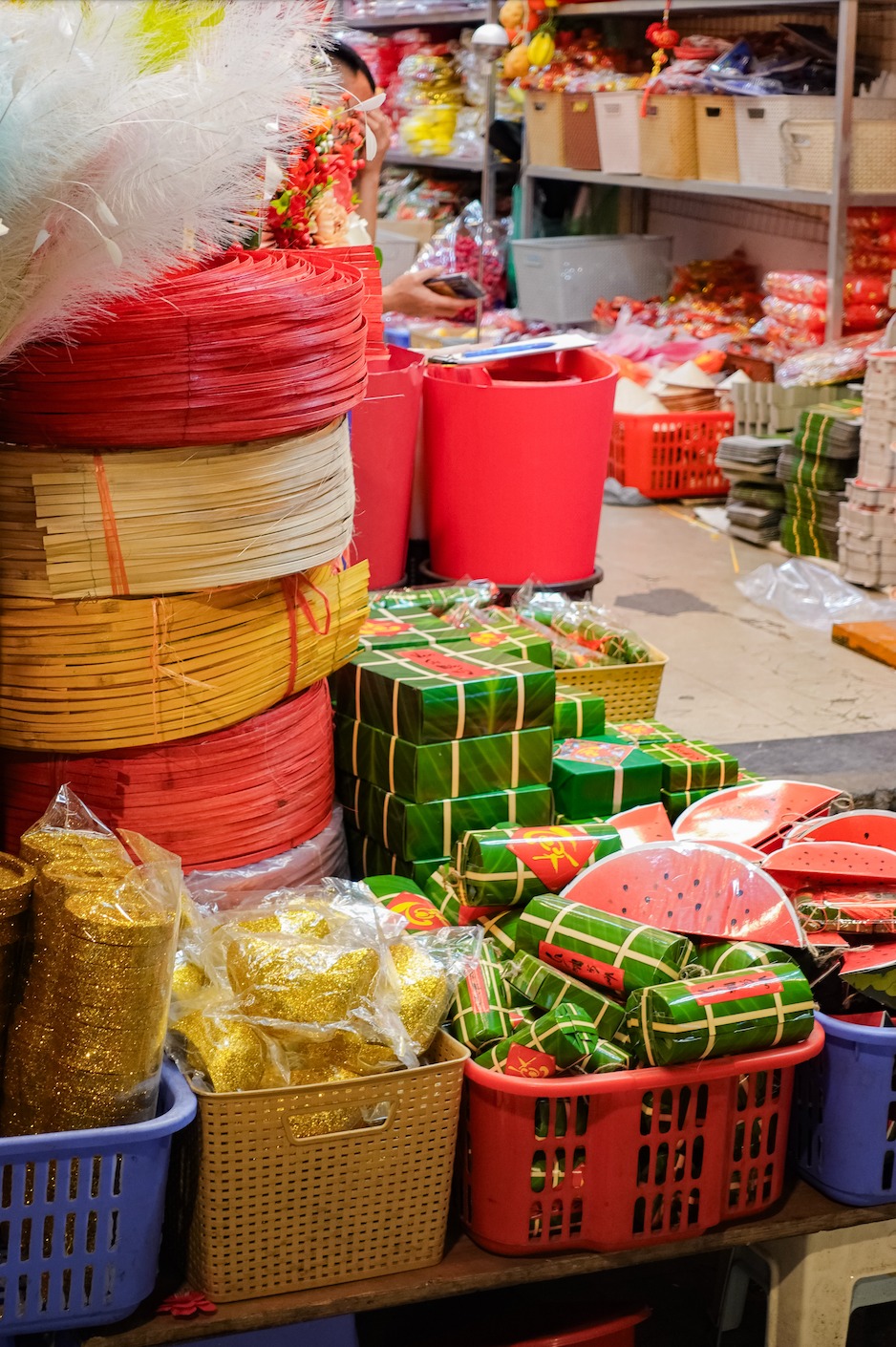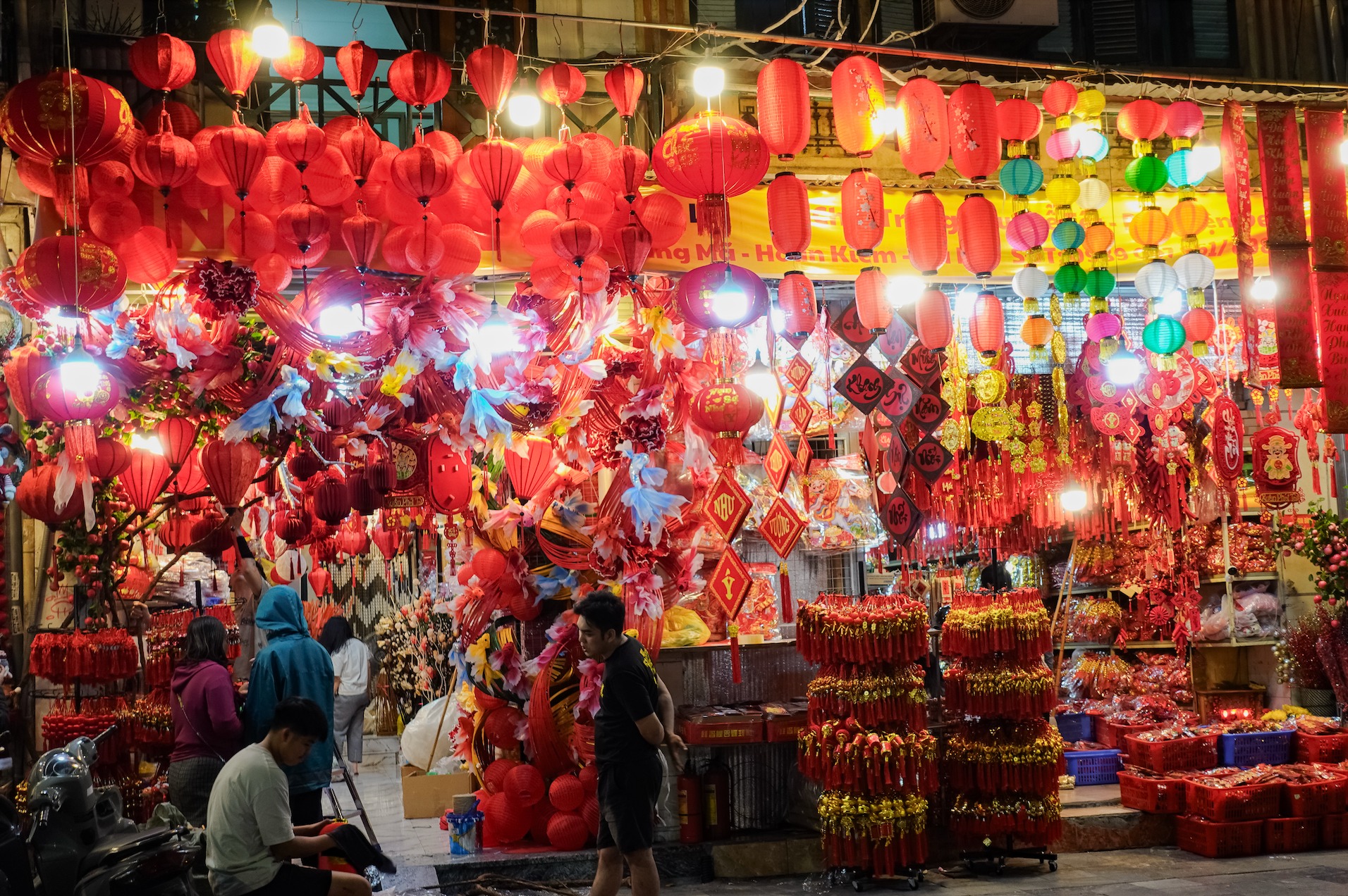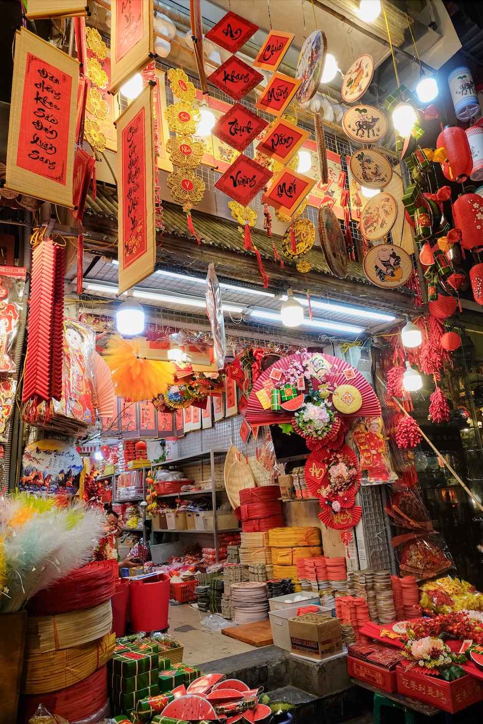 Những quả cầu trang trí đỏ rực, dây treo chữ chúc năm mới, phong bao lì xì, đồ decor mang không khí xuân bắt đầu xuất hiện ngay cạnh các cửa hàng bán đồ Giáng sinh. Màu đỏ đặc trưng của Tết nổi bật hẳn lên giữa không gian Noel, tạo nên một khung cảnh vừa lạ lẫm, vừa thú vị.