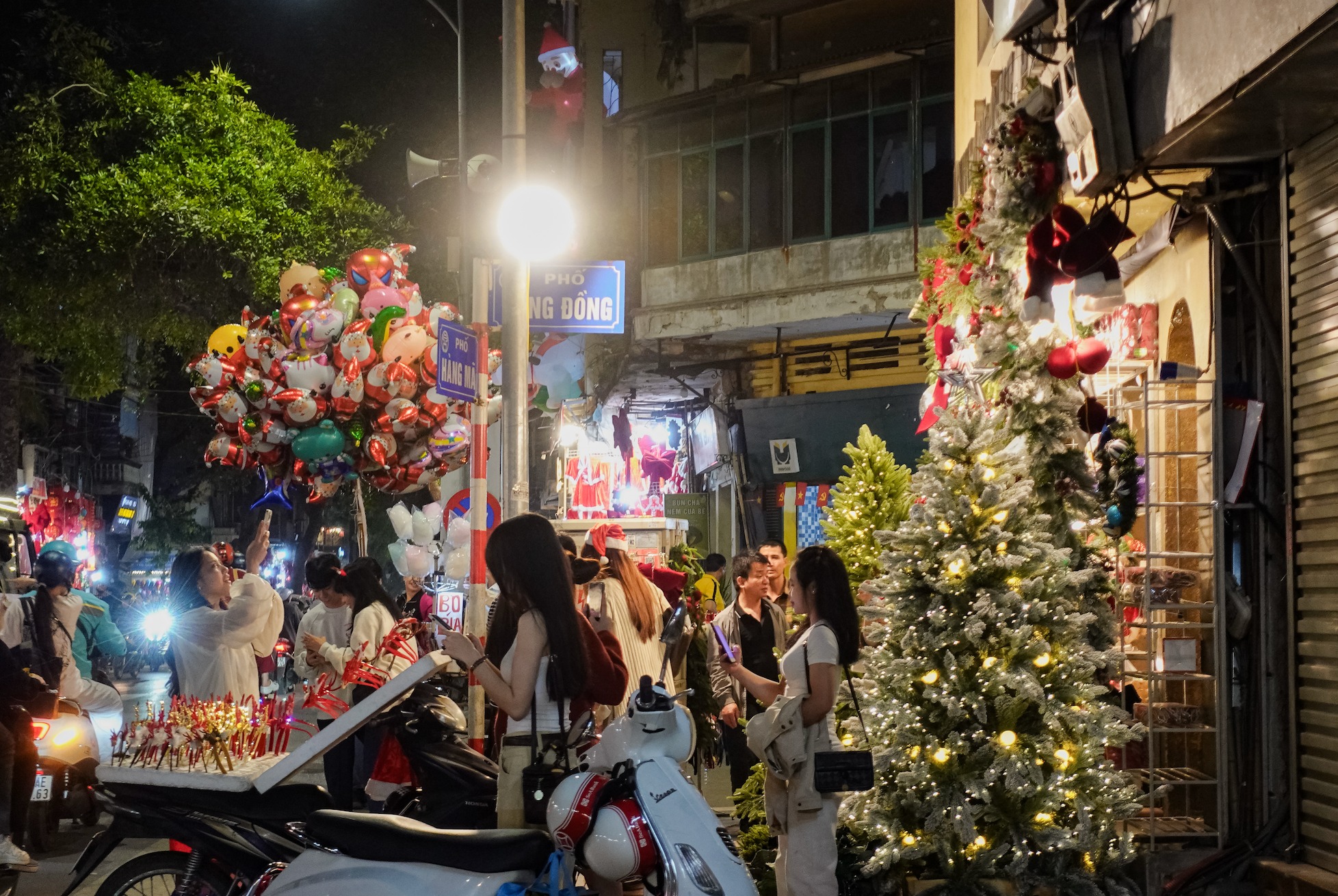 Giữa đêm Noel se lạnh, Hàng Mã vì thế không chỉ mang sắc màu lễ hội quen thuộc, mà còn thêm vào một nét "độc lạ" rất riêng - nơi Giáng sinh và Tết vô tình gặp nhau trên cùng một con phố, khiến ai đi qua cũng khó quên.