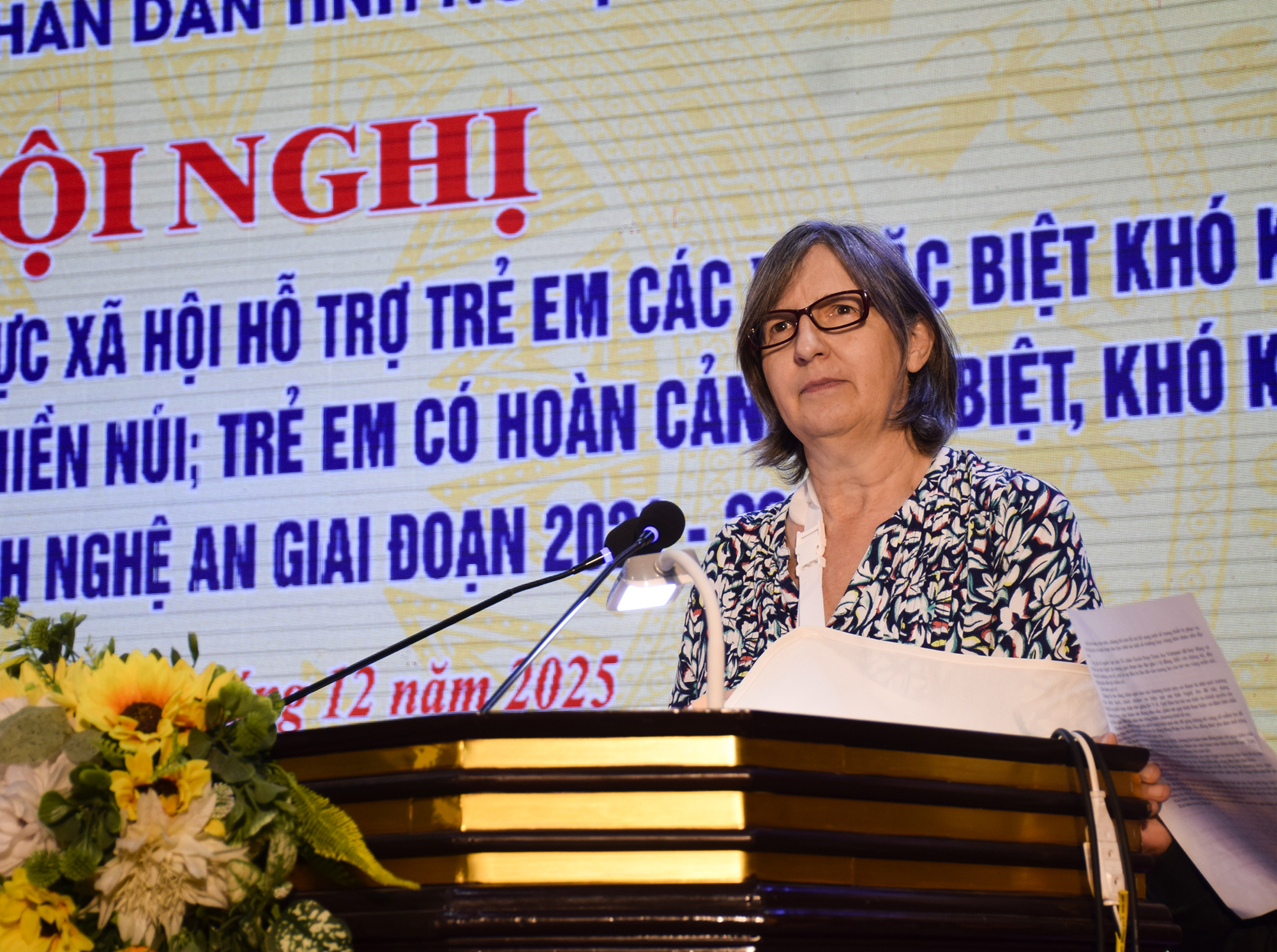 Bà Michele Madeleine Potee – Chủ tịch Tổ chức Ecole Pour Tous Au Vietnam tham luận nội dung: “Cam kết tiếp tục đồng hành và tăng cường nguồn lực hỗ trợ giáo dục và cơ sở vật chất cho các xã miền núi, xem giáo dục là chìa khóa để trẻ em vùng khó Nghệ An phát triển”. |