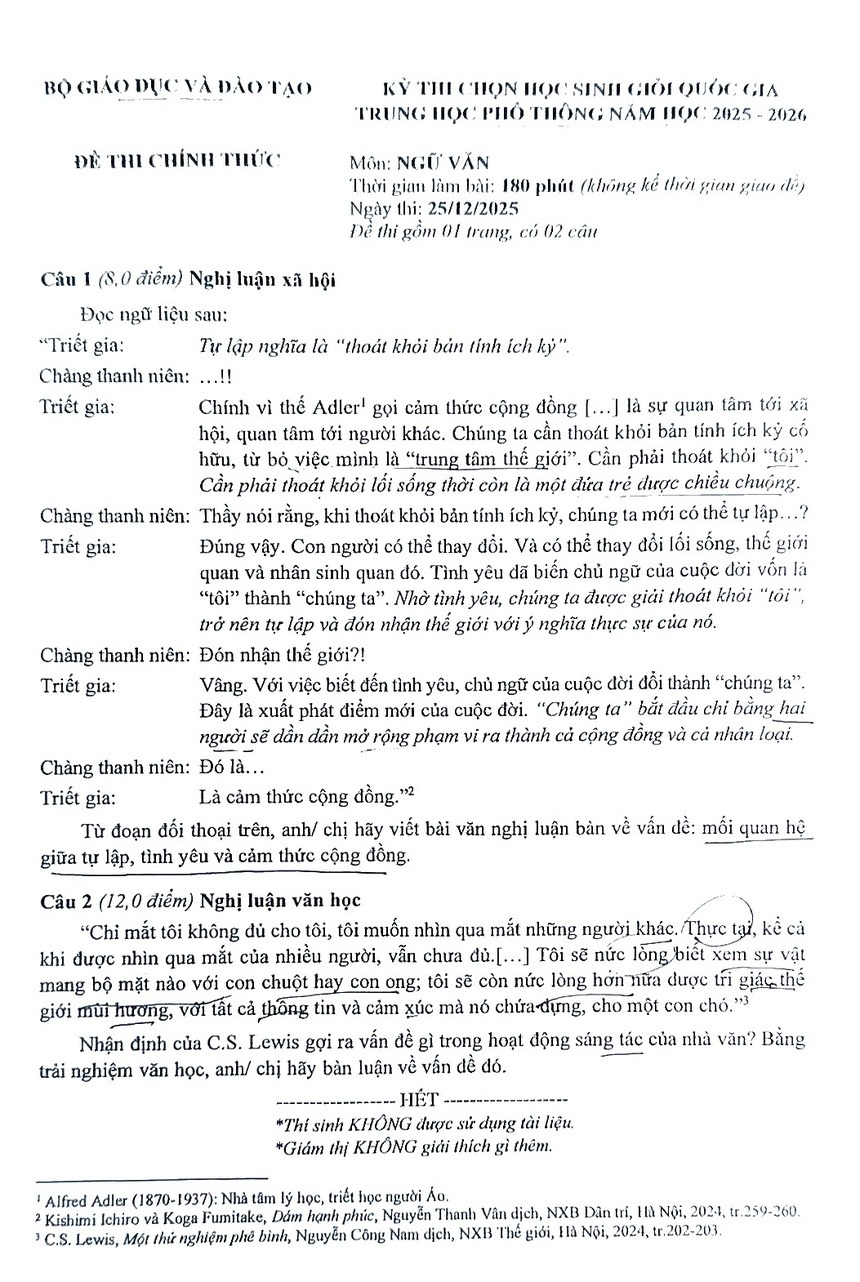 Ngày 25/12, học sinh tham dự kỳ thi học sinh giỏi quốc gia môn Ngữ văn đã hoàn tất bài thi của mình. Ngay sau khi được chia sẻ, đề thi thu hút sự chú ý của dư luận về độ khó, chiều sâu triết luận và yêu cầu cao về năng lực tư duy của thí sinh.