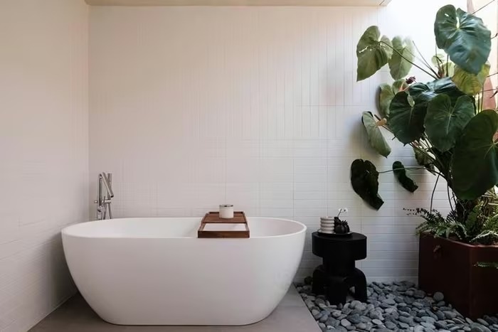 Bồn tắm độc lập đặt cạnh khoảng xanh nhỏ, được mở sáng và thông gió tự nhiên, mang lại cảm giác thư giãn như spa tại nhà. Ảnh: Archdaily |